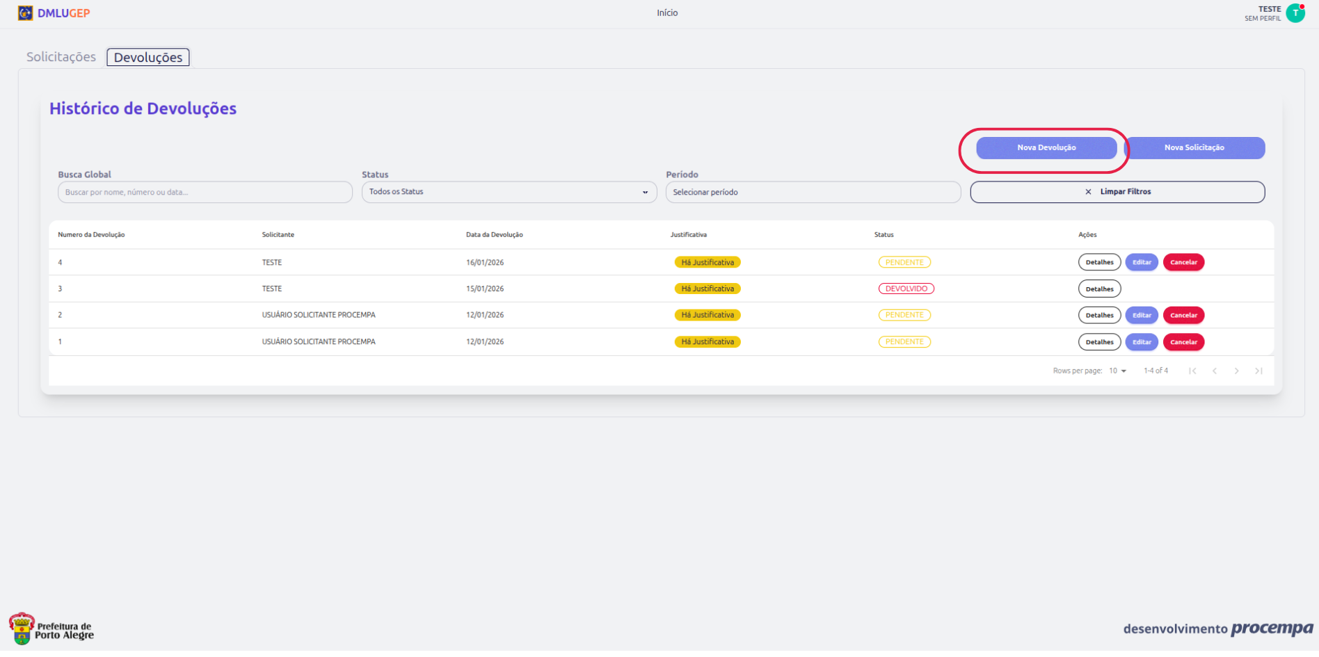 3. Clique em "Nova Devolução"