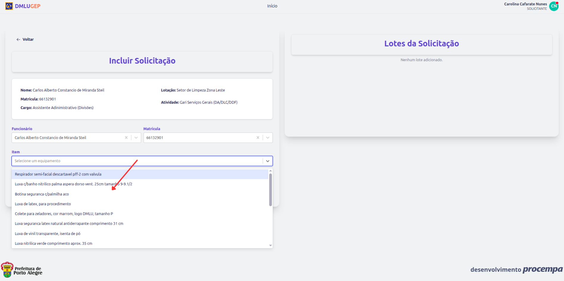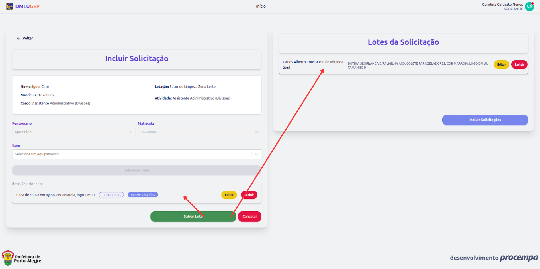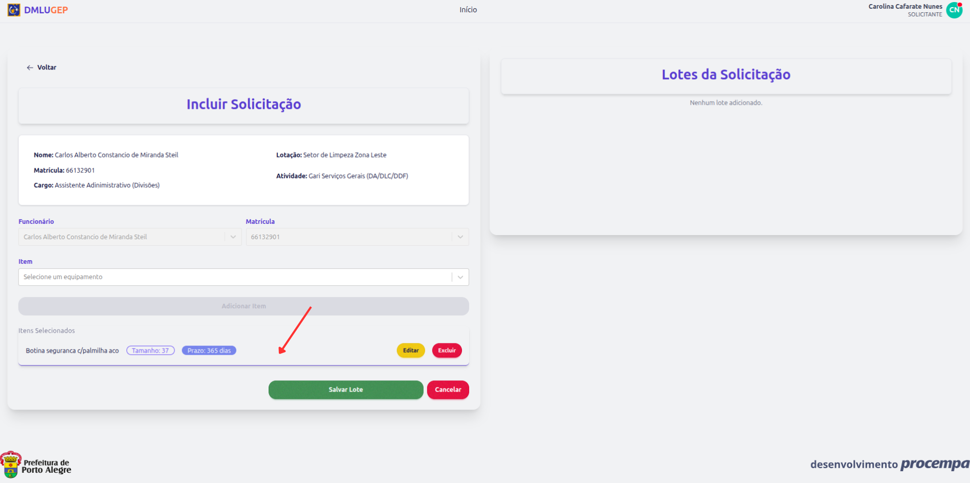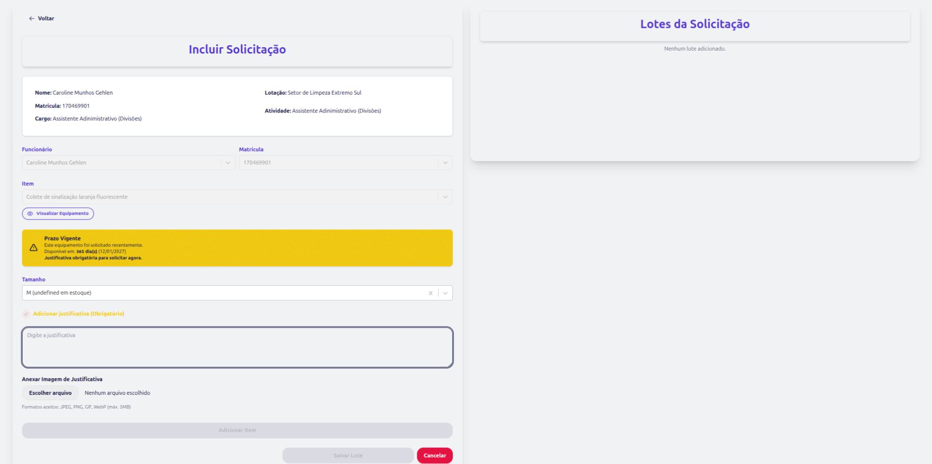 - Os campos do formulário serão limpos para adicionar mais itens, assim criando uma solicitação em lote.