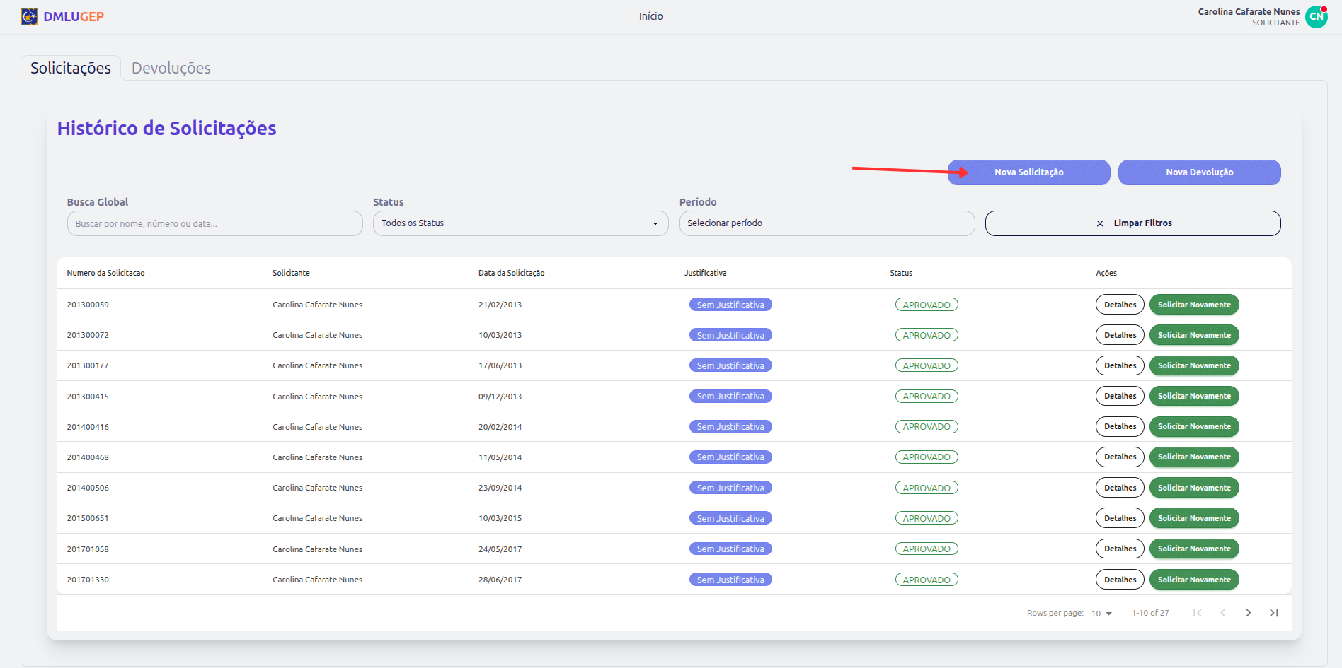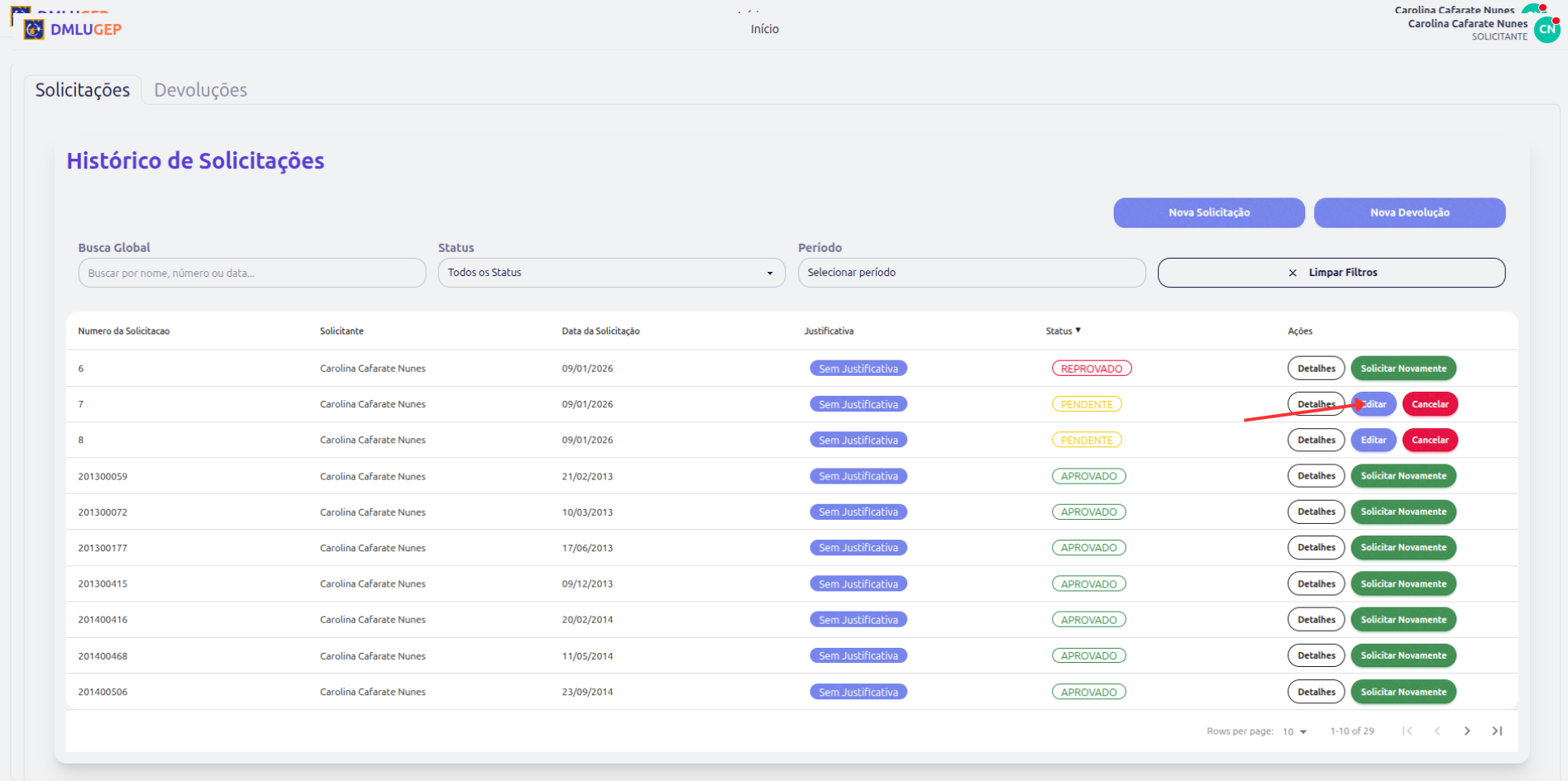 1. Na página inicial, localize uma solicitação anterior (status: Devolvido ou Reprovado)