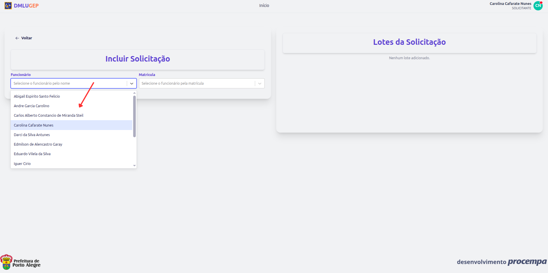 - No campo "Selecione o funcionário", digite o nome do funcionário
