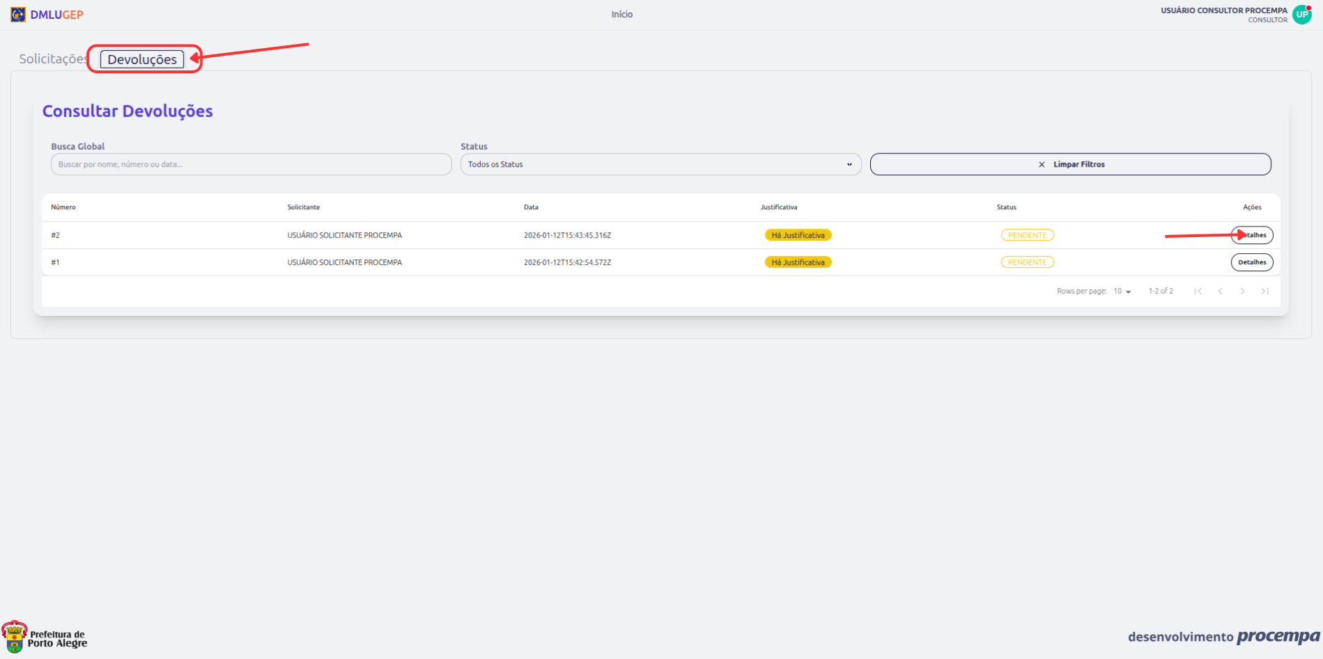 - Clique no botão "Detalhes" para ver informações completas da devolução