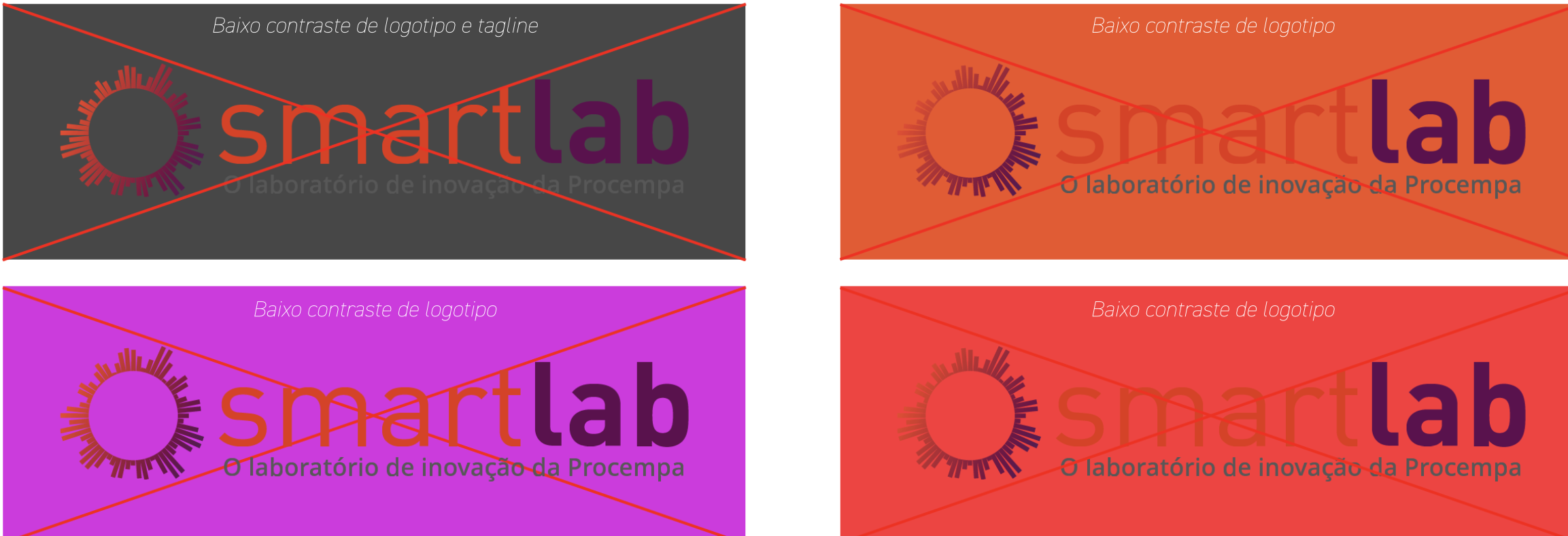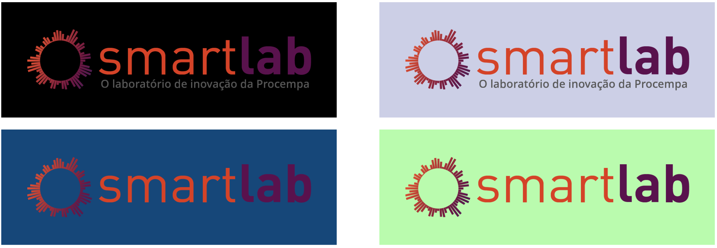 O principal aspecto a ser levado em consideração quando da aplicação da assinatura do Smartlab sobre fundos sólidos é o cuidado com o contraste figura-fundo, para que logotipo, tagline, ícones, ou sejam quais forem os elementos, estejam sempre visíveis sem intervenção ou ruídos das cores do sólido por sobre onde a marca está aplicada, como nos exemplos abaixo.