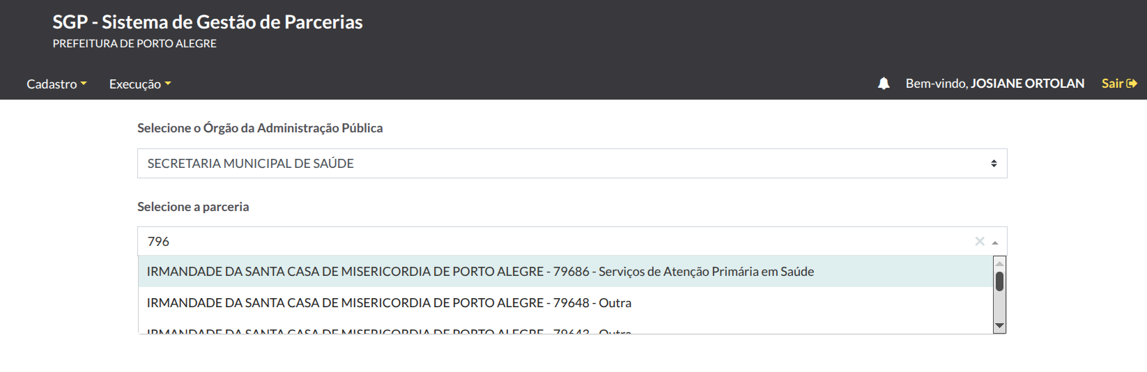 Ao acessar qualquer umas das opções, caso o usuário tiver apenas vinculado a termo de colaboração, ele será redirecionado diretamente para o termo. Porém, se tiver vários termos, será possível selecionar o órgão/secretaria da prefeitura, bem como como o termo/entidade vinculado. É possível digitar o número do termo para auxiliar na seleção.