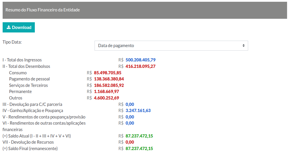 As entidades tem acesso a visualização dos totalizadores tanto de ingresso de recursos oriundos dos pagamentos efetuados pela prefeitura, bem como aos totalizadores das devoluções de recursos e ganhos de aplicação/poupança por ela lançados. Também é possível ver os totais de acordo com classificação dos gastos e com o tipo de data (data de emissão ou pagamento da despesa).